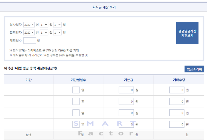 좀 더 정확한 퇴직금 계산이 필요하신 분들은 위의 고용노동부에서 제공하는 퇴직금 계산기를 사용해 보시는 것을 추천드립니다.
