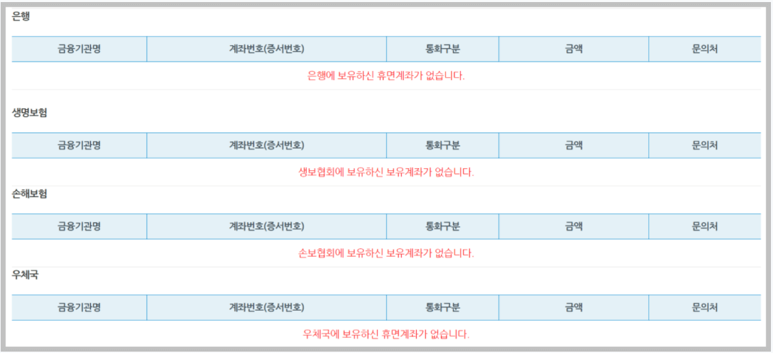 하지만 아래의 계좌정보통합관리 서비스의 경우 전체 은행계좌에 있는 모든 휴면 금액을 조회할 때 사용되는 것이 일반적입니다.